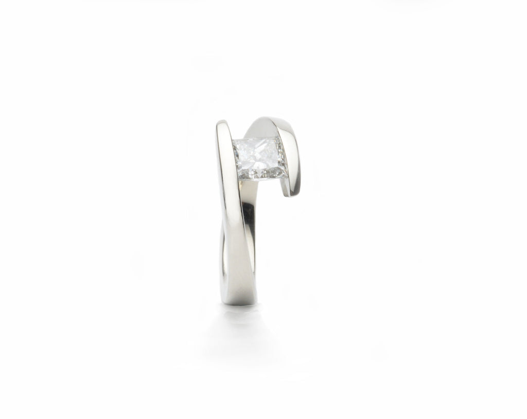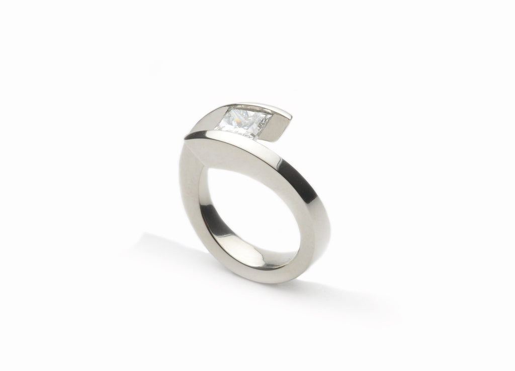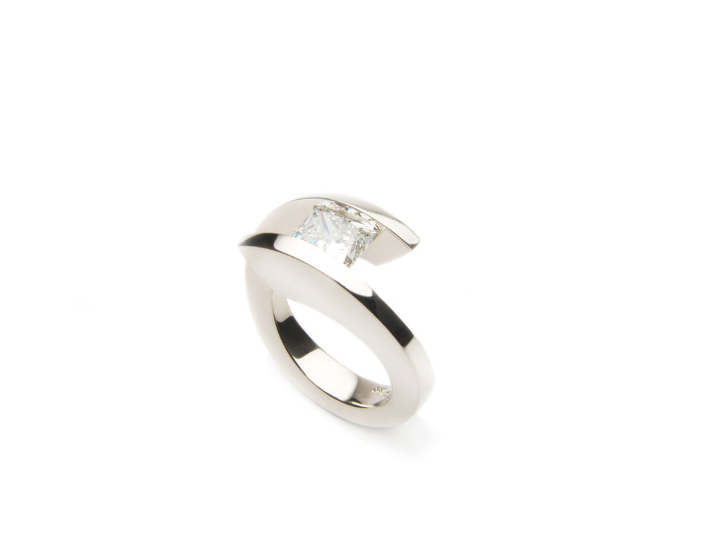 Tension ring VIRTUOSO, eighteen karat white gold with a large Princess cut diamond. Price inquiry.
