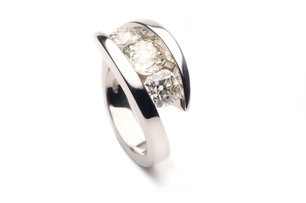 Custom ring in eighteen karat white gold with 3 diamonds.