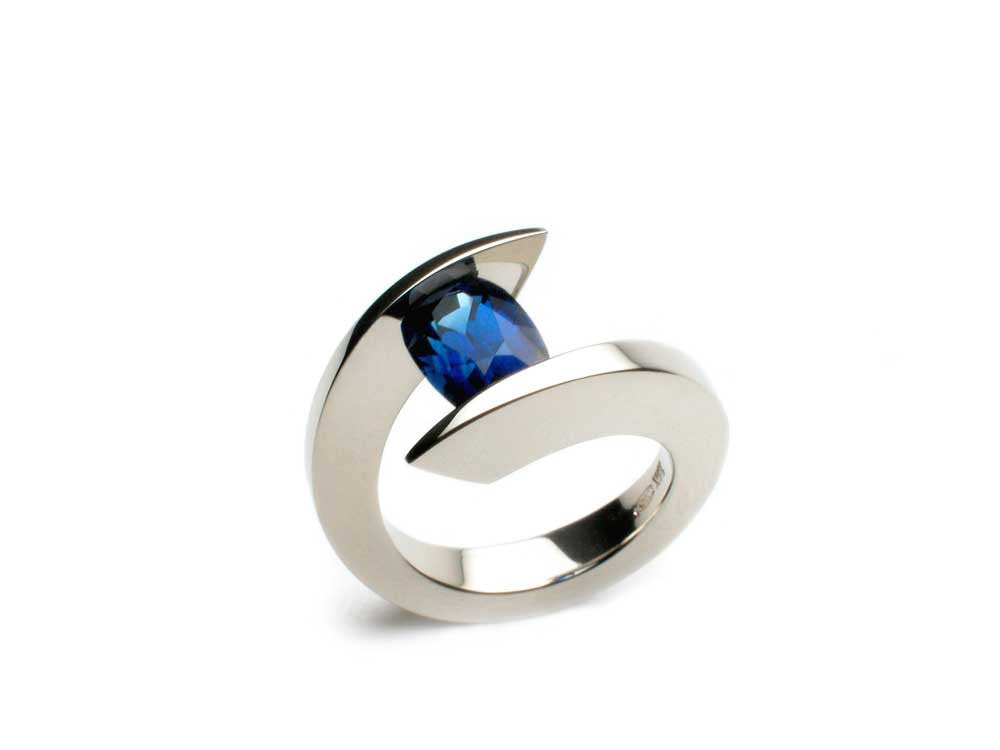 Blue Sapphire pressure-set in eighteen karat white gold. Price upon request.